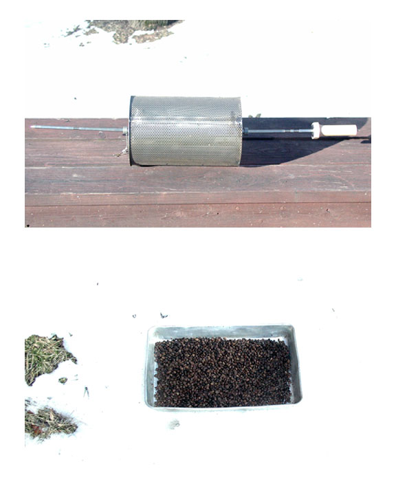 Above is a photo of my roasting set up. Mostly I use the Hottop. The Hearthware Gourmet lives on in semi-retirement. The Hottop is the roaster of choice due to quality and consistency of roast as well as the fact that it can roast batches of up to 10 oz at a time. The Hearthware Gourmet is limited to about 3.5oz at a time. Still is is good for blends where you wish to control the roast for each type of bean separately. I also use it occasionally for small batches of decaf. I am not much of a decaf drinker so in order to keep the decaf fresh I prefer to roast very small quantities at a time. The Hottop is sold by Coffee Bean Corral, Sweet Marias, and Hottop USA. The Variac on the right side of the photo is used to adjust the voltage to each device. It can be adjusted above or below the incoming AC line voltage allowing more control over the roast time and profile. Typically I increase the voltage above line voltage to the Hottop for larger batches of beans to ensure it doesn't time out and eject the beans before they are done. With the Hearthware Gourmet is used the variac is more typically used to slow the roasts which otherwise complete very quickly. I could not post information on the Hottop here than could possible touch what is already available on Randy Glass' Espresso My Espresso site. If you wish to jump directly to the Hottop pages check out: While you are checking out the site above, you're insane if you don't download and try the Biscotti recipe. Happy roasting, drinking, AND eating! Here's the new kid on the block, the RK Roasting Drum. The first batch of 1.25lb of Columbian looks beautiful. I anticipate great taste. I'll let you know more on actual taste success later. See photo below for most creative use of a snowbank. Yes, the white areas with no detail is snow.